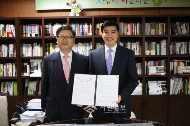 [시민일보]서울 강동구는 지난 8일 강동역 인근에 아파트를 신축하는 에스엘디엔씨(주)와 협약을 맺어 단지내에 구립어린이집을 건립하고 입주민 자녀에 우선 입소권을 보장하기로 했다. 사진은 협약체결 후 기념촬영을 한 에스엘디엔씨(주) 피인찬 대표이사(좌)와 이해식 강동구청장의 모습(우).