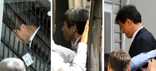 내란음모 등의 혐의로 구속기소된 통합진보당 이석기 의원과 홍순석 경기도당 부위원장 등 통진당 관계자 3명에 대한 공판준비기일이 경기 수원지법에서 진행된 14일 오후 홍순석 통진당 경기도 부위원장, 이상호 수원진보연대 지도위원, 한동근 통진당 전 수원시위원장(왼쪽부터)이 호송차에서 내리고 있다.