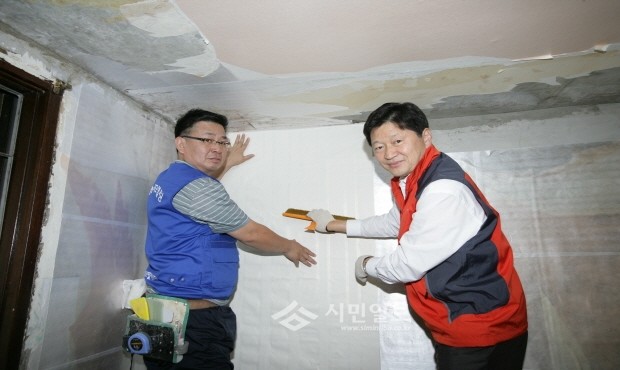 서울 중구는 지난 12일 다산동에 위치한 저소득 한부모 가정집에서 자원봉사를 실시했다. 사진은 자원봉사에 참여한 최창식 중구청장과 KH리모델링 직원이 도배를 하는 모습.