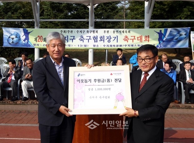 지난 13일 열린 제20회 수지구축구협회장기 축구대회 개막식에서 용인시 수지구 축구협회가 복지사각지대에 있는 저소득층에게 써달라며 수지구청에 성금 100만원을 전달했다. 사진은 금품전달식을 하는 이연희 수지구청장(좌)과 윤원균 수지구 축구협회장(우)의 모습.