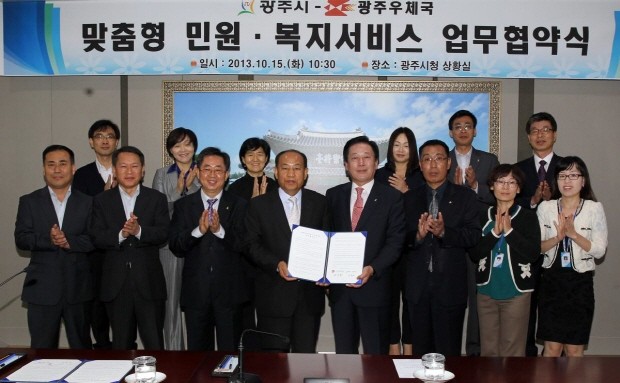[시민일보] 광주시는 지난 15일 시청 상황실에서 광주우체국과 ‘민원·복지 서비스 업무협약’을 체결하고 소외계층 복지를 위해 힘쓴다. 사진은 업무협약식 후 기념촬영하는 모습.