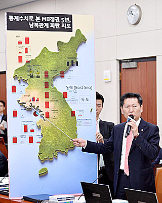 정청래 민주당 의원이 15일 오전 서울 여의도 국회에서 열린 외교통일위원회 2013 국정감사에서 준비한 ‘통계수치로 본 MB정권 5년, 남북관계 파탄 지도’를 들고 류길재 통일부 장관에게 질의하고 있다.