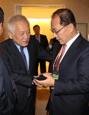 15일 오전 서울 광진구 쉐라톤 그랜드 워커힐 호텔에서 매경미디어그룹 주최로 열린 14회 세계지식포럼에서 황우여 새누리당 대표와 김한길 민주당 대표가 인사를 나누고 있다.