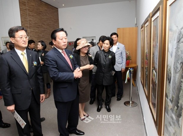 지난 15일 경기 광주시농업기술센터가 광주시 문화스포츠센터에서 개최한 꽃누르미 작품전시회 개막식이 열렸다. 사진은 전시회장에서 작품을 감상하는 조억동 광주시장의 모습.