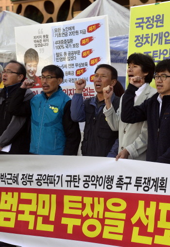 민주노총 등 시민단체 대표자들이 16일 오전 서울 중구 시청 앞 광장 시국 농성장 앞에서 '정부의 공약파기 규탄, 공약 이행 촉구 투쟁' 발표 기자회견을 하고 있다.