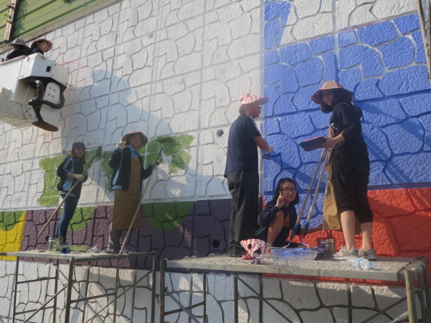 서울 중랑구 망우본동 주민자치위원회와 송곡여고 미술반이 최근 9개 초·중·고등학교 학생들이 등교길로 이용하는 송림길 철로벽면에 벽화를 그려 송림길의 경관이 개선됐다. 사진은 송곡여고 미술반이 벽화 작업을 하는 모습.