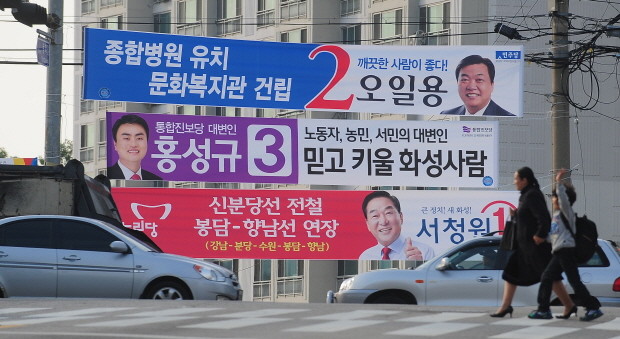 [시민일보] 10·30 국회의원 화성갑 보궐선거 공식선거운동이 시작된 17일 오후 경기 화성 봉담읍 거리에 새누리당 서청원, 민주당 오일용, 통합진보당 홍성규 후보의 현수막이 나란히 걸려 있다.