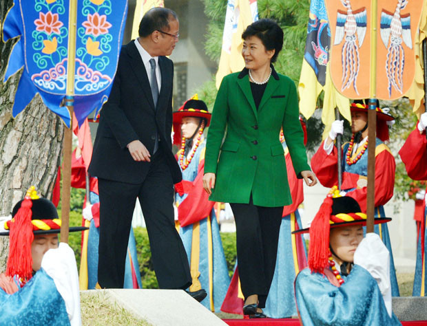 박근혜 대통령이 17일 오후 청와대에서 열린 베니그노 노이노이 아키노(Benigno Simeon Cojuangco Aquino III) 필리핀 대통령 공식 방한 국빈환영식에 참석, 아키노 대통령 함께 전통의장대 통과하여 사열대로 향하고 있다.