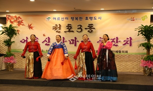 [시민일보] 지난 16일~오는 29일 강동구의 각 동 주민센터, 주민자치위원회와 지역내 직능단체들이 65세 이상 노인들을 대상으로 경로잔치를 열고, 노인복지 기여자들에게 강동구청장 표창을 수여하고 있다. 사진은 웨딩홀에서 열린 천호3동 경로잔치의 민속공연 모습.