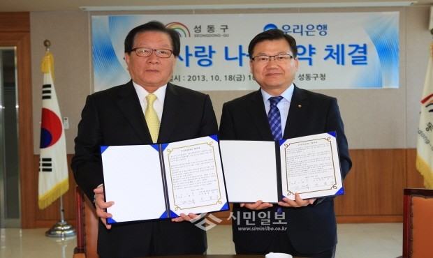 [시민일보]지난 18일 서울 성동구와 우리은행 성동지역본부가 다양한 기부활동과 협력프로그램들을 함께 실시하고 지역내에 나눔문화를 확산시키기 위해 '나눔협약'을 체결했다. 사진은 협약을 체결한 고재득 성동구청장(왼쪽)과 이점수 우리은행 성동지역본부장의 모습.