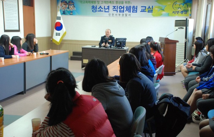 직업체험교실은 진동화 경무과장의 인사말 및 경찰서 소개에 이어 경찰홍보영상 시청, 경찰계급 및 직제, 장구류 소개, 성폭력 예방 강의, 청소년 직업체험 교육, 112 종합 상황실 견학 순으로 진행됐다.