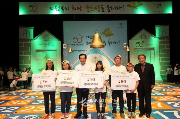 경기 의정부시(시장 안병용)는 지난 18일 의정부예술의전당 대극장에서 '의정부시 희망 골든벨을 울려라' 퀴즈대회를 개최했다. 사진은 최종 골든벨 문제에 도전한 회룡초교 소아란 학생을 비롯한 수상자들과 안병용 시장 모습.