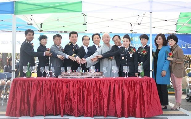 | ▲ 경찰의 날 행사에 참여한 내빈들이 기념 시루 떡을 자르며 포즈를 취하고 있다. | ||