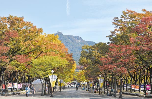 쾌청한 가을 날씨를 보인 21일 오후 경기 과천시 막계동 서울대공원에서 시민들이 단풍이 물든 가로수길을 걷고 있다.