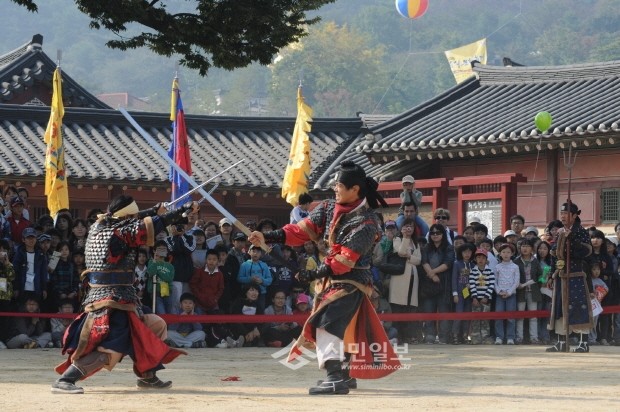10년째 공연되고 있는 화성 행궁무예 24기 프로그램이 탄탄한 구성과 완성도 높은 연기로 화성 관광의 주요 볼거리로 떠오르고 있다. 사진은 22일 화성행궁 신풍루에서 관람객 1천여명이 모인 가운데 시범공연을 하는 모습.