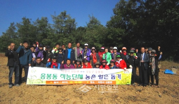 [시민일보]서울 성동구 응봉동 주민센터가 지난 18일 자매결연지인 이천시 신둔면을 방문해 수해 위문성금 100만원을 전달하고 고구마 수확 작업을 도왔다. 사진은 이날 일손 돕기에 참여한 응봉동 주민들과 신둔면 관계자들의 모습.