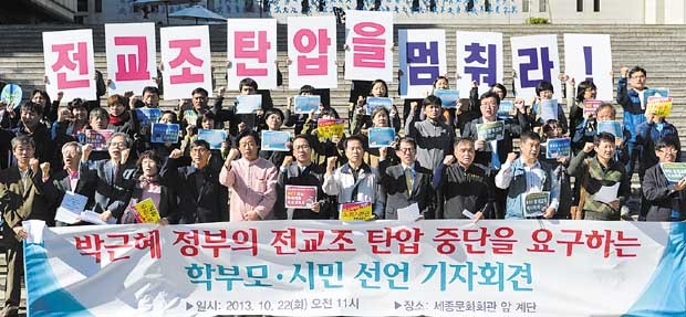 22일 오전 서울 종로구 세종문화회관 앞 계단에서 열린 박근혜 정부의 전교조 탄압 중단을 요구하는 학부모·시민 선언 기자회견에서 참가자들이 구호를 외치고 있다.