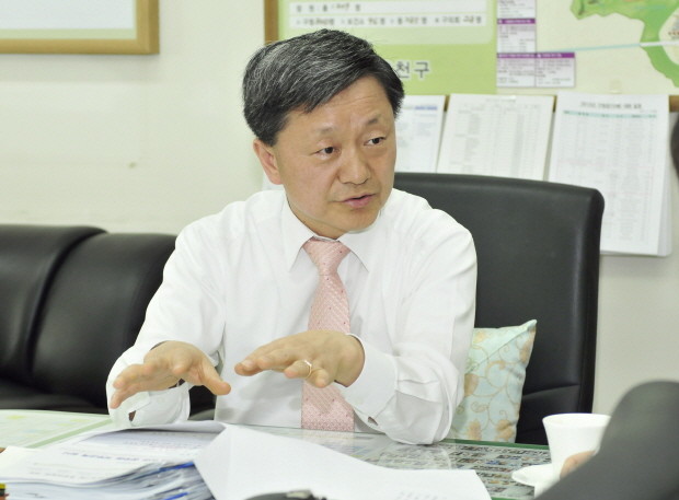 | ▲ 인터뷰 중 전귀권 양천구청장 권한대행이 양천구 시설들에 대해 말하고 있다. | ||