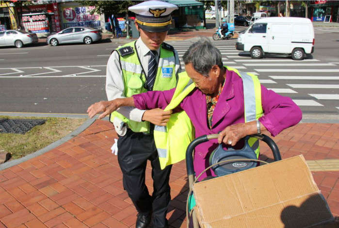 | ▲ 계양서 직원이 노인에게 야광조끼를 입혀 드리고 있다. | ||