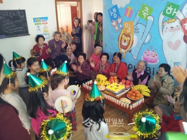 서울 은평구 갈현2동복지두레위원과 자원봉사자들은 지난 22일 갈현2동 경로당에서 노인 4명의 생일잔치를 열었다. 이날 생신잔치에는 지역내 유치원 원아들이 경로당을 방문하여 재롱잔치 및 안마 등의 활동을 펼쳤다. 사진은 유치원 아이들의 재롱잔치를 보고있는 노인들의 모습.