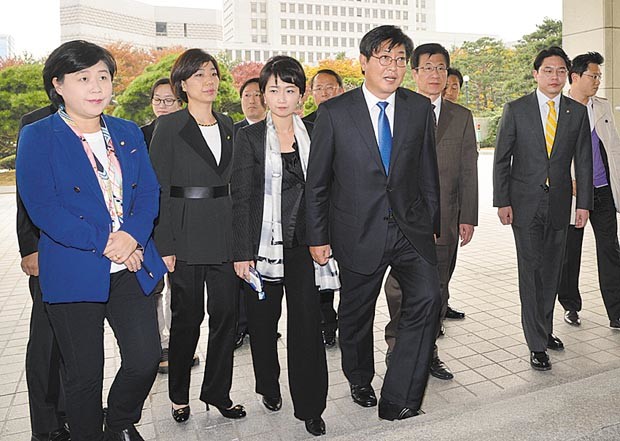 민주당 신경민 최고의원, 이춘석 법사위 간사를 비롯한 국회 법제사법위원회,정무위원회 소속 의원들과 원내부대표단, 대변인단이 윤석열 여주지청장의 국가정보원 대선개입 의혹사건 수사팀장 원상회복과 국정원의 불법선거개입에 대한 수사권보장 등을 요구하기 위해 28일 오후 서울 서초구 서초동 대검찰청에 항의방문하고 있다.