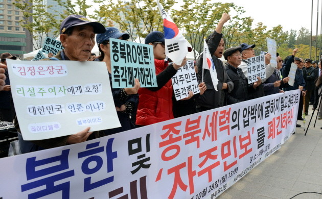 28일 오후 서울 중구 태평로 서울시청 앞에서 대한민국어버이연합과 블루유니온 등이 '종북매체 자주민보 폐간 촉구 기자회견'을 열고 있다.