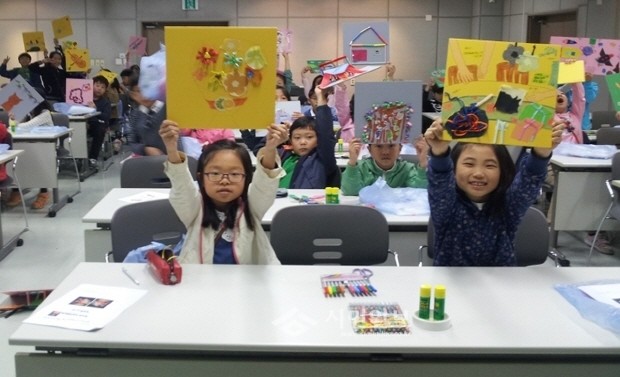 [시민일보]경기 인천연수도서관은 지난 21~28일 총 3회에 걸쳐인천연화초등학교 3학년 학생을 대상으로 스스로 도서관을 이용한 과제 해결능력을 키우기 위한 특강을 진행했다. 사진은 콜라주 수업에서 자기가 만든 작품을 들어 보이고 있는 아이들의 모습.