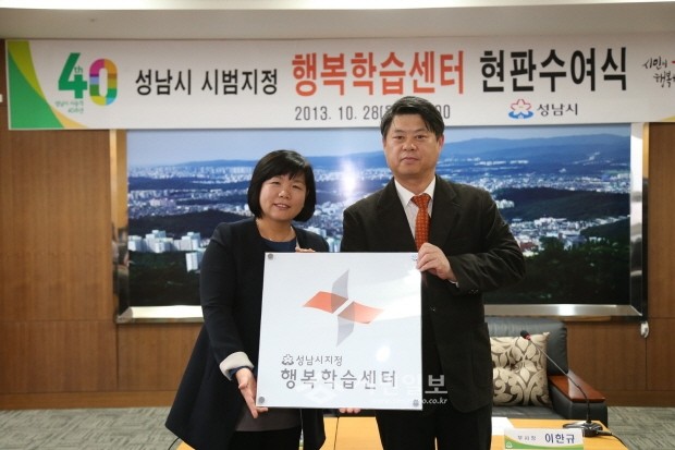 경기 성남시 곳곳에 설치된 22개 다목적 복지회관이 '행복학습센터'로 지정돼 지역주민들이 평생교육을 받을 수 있게 된다. 사진은 지난 28일 시청에서 열린 현판 수여식에 참여한 이한규 부시장과 김원숙 다목적복지회관 연합회장의 모습.