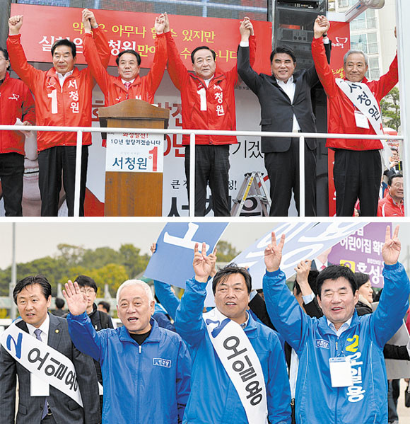 10.30 경기도 화성갑 재보궐선거를 하루 앞둔 29일 오후 경기도 화성 봉담읍 거리에서 서청원 새누리당 후보가 의원들과 함께 손 잡고 인사하고 있다(위). 민주당은 기아자동차 화성공장에서 김한길 대표와 오일용 후보 등 의원들이 퇴근하는 관계자들을 향해 인사하고 있다.