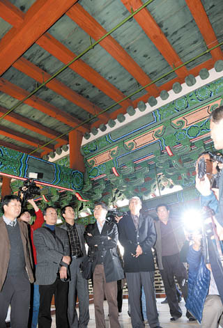 문화재청이 숭례문에 대해 단청공사를 중심으로 복구공사 전반에 대한 1차 종합검진을 실시한 30일 오후 서울 중구 남대문로 숭례문에서 종합점검단원들이 점검부분에 대해 논의를 하고 있다.