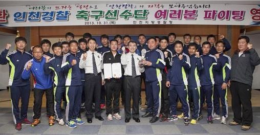 | ▲ 제10회 경찰청장배 축구대회에서 공동 3위의 성적을 거둔 인천경찰청 선수들이 이인선 청장과 함께 기념촬영을 하고 있다. | ||
