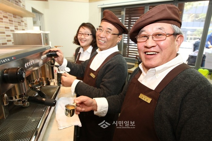 서울 종로구는 지난 1월 초부터 종로구청 본관 1층 후문 옆에 7명의 노인들이 직접 커피를 만들어 합리적인 가격으로 판매하고 있다. 최근 이 '플러스카페(Plus Cafe)'는 개업 초기에 비해 3배가 넘는 매출을 올리고 있다. 사진은 '플러스카페'에서 에스프레소를 추출하고 있는 노인들의 모습.
