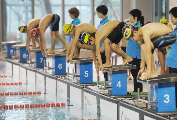 [시민일보]경기 오산시는 지난 2~3일 오산시 시민스포츠센터에서 ‘제1회 오산시장배 전국유소년 수영대회’를 성황리에 마쳤다. 사진은 대회에 출전한 학생들이 출발하기 직전의 모습.