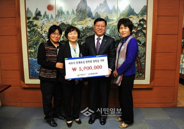 지난 1일 여주시 여성단체 협의회가 제25회 여주도자기축제 먹거리 장터 운영으로 얻은 수익금 중 500만원을 여주시 인재육성 장학회 장학금으로 기탁했다. 사진은 장학금 기탁식 중 기념촬영을 한 김춘석 여주시장(오른쪽 두번째)과 이인순 여성단체협의회 회장(왼쪽 두번째)의 모습.