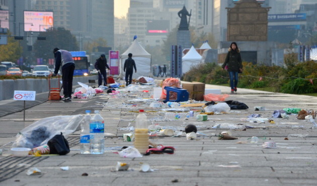 4일 오전 서울 중구 광화문광장에서 전날 열린 각종 축제 동안 버려진 쓰레기들이 어지럽게 널브러져 있다.