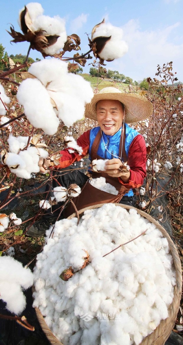 입동을 사흘 앞둔 4일 경남 함양군 상림공원 인근에서 임채정(62)씨가 보송보송한 목화솜을 수확하고 있다.