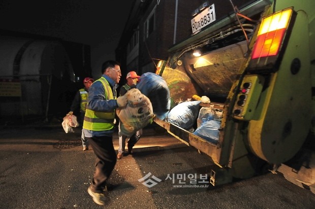 경기 김춘석 여주시장은 지난 5일 여흥동 소속 환경미화원들과 함께 관할 지역의 쓰레기를 수거하는 일일 환경미화원체험을 실시했다. 사진은 새벽에 청소차를 타고 돌며 쓰레기를 수거하는 김춘석 여주시장의 모습.