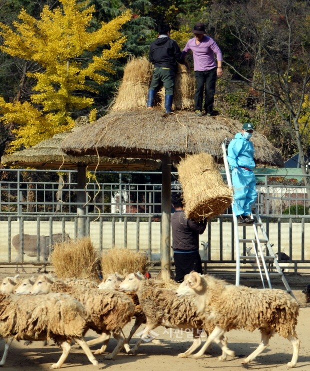 [시민일보]5일 광주 북구 우치동물원에서 양들의 따뜻한 겨울나기를 위해 동물원 수의사와 관리사들이 그늘막 초가 지붕의 볏집(이엉)을 새 것으로 교체하고 있다.