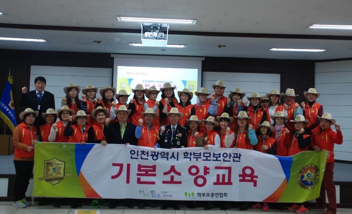| ▲ 학부모보안관 소양교육 참가자들이 기념촬영을 하고 있다. | ||