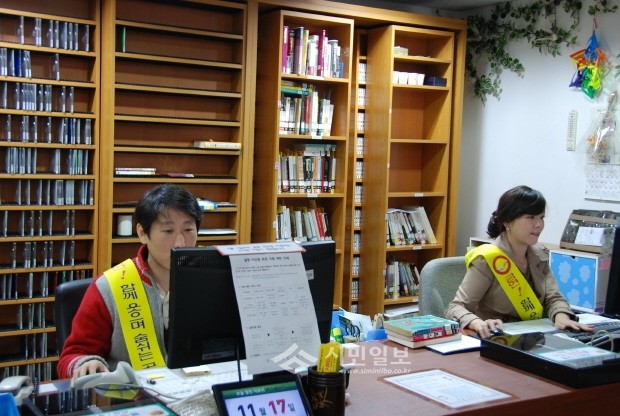 [시민일보]서울 은평구 구립도서관이 이달부터 한 달간 도서관 인근에서 흡연하는 이용자가 줄지 않아 도서관 직원 모두가 업무시 도서관이 금연 구역임을 알리는 내용의 어깨띠를 착용하는 “클린 도서관” 만들기 운동을 벌인다. 사진은 지난 3일 어깨띠를 하고 업무를 보는 직원들.