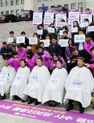 통합진보당 오병윤 원내대표를 비롯한 김선동, 김미희, 김재연, 이상규 의원이 6일 서울 여의도 국회 본청 앞 계단에서 열린 민주주의 수호 통합진보당 사수 결의대회에서 삭발식을 갖고 있다.