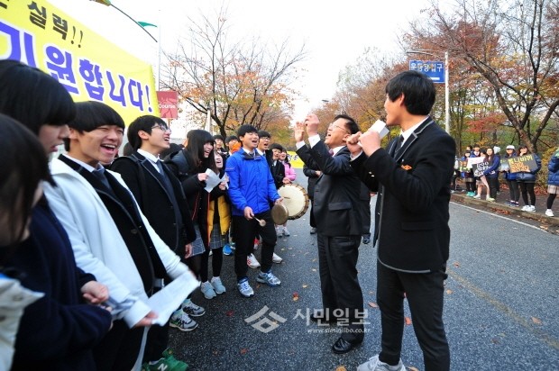 [시민일보]2014학년도 대학수학능력시험일인 7일 김춘석 여주시장은 오전 7시20분부터 수능시험이 치러지는 여주중, 세종중, 세종고, 여주고 등을 차례로 방문해 후배 학생들, 학부모들과 함께 수험생을 응원했다. 사진은 김 시장과 후배 학생들의 응원모습.