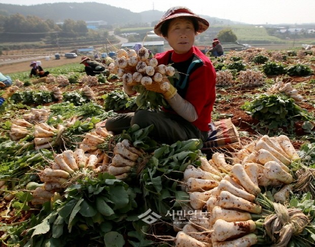 7일 알타리무 주산지인 충남 태안군 태안읍 남산리에서 아낙네가 갓 수확한 알타리무를 들어보이고 있다.