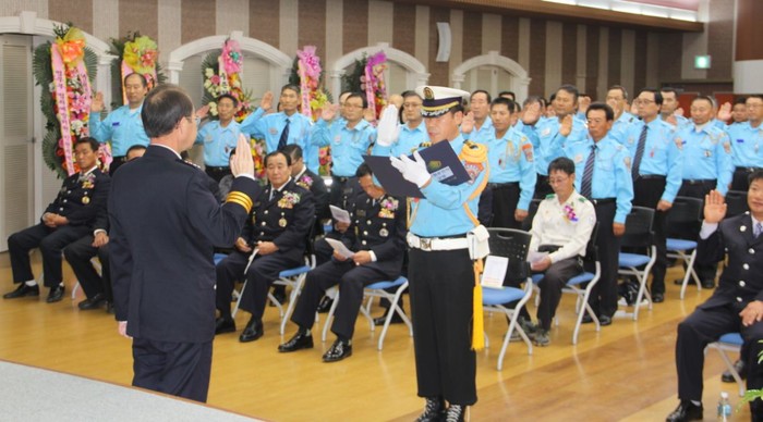 | ▲ 황순일 서장이 모범운전자들로부터 선서를 받고 있다. | ||