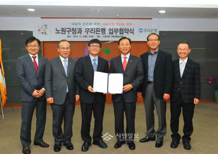 서울 노원구는 지난 8일 지역내 소외 계층을 위한 사회공헌 활동과 민·관협력 사업 추진을 위한 우리은행 중랑노원영업본부와 ‘상호 교류 협력 협약식’을 맺었다. 사진은 김성환 구청장과 우리은행 중랑노원영업본부 직원들이 협약식을 맺고있는 모습.