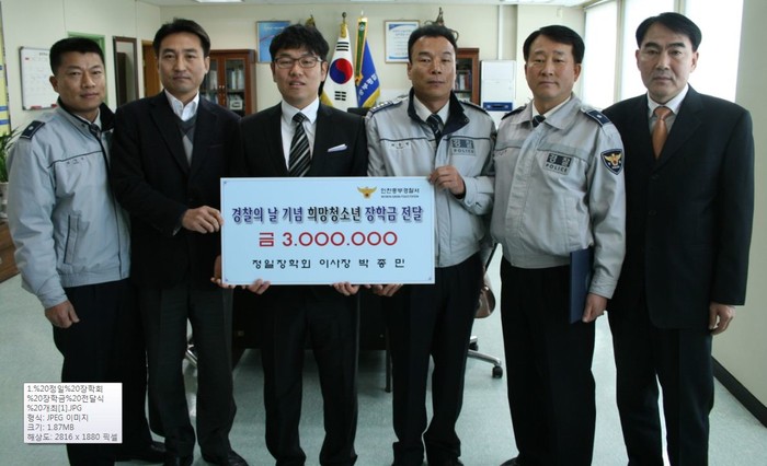 정일장학회는 평소 국민들을 위해 불철주야 치안 활동을 충실히 해온 경찰관의 노고에 보답하기 위해 중부서 경찰관 자녀들에게 장학금을 전달했다.