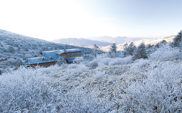 11일 새벽 지리산 세석산장 일대에 1cm 미만의 첫눈이 내려 나뭇가지 등 물체에 서리가 하얗게 얼어붙은 상고대 현상도 관측됐다.