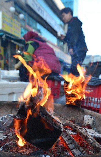 이틀째 초겨울 추위가 이어진 12일 오전 서울 중구 중림동 도깨비 어시장에서 상인들이 모닥불을 피워놓고 있다.