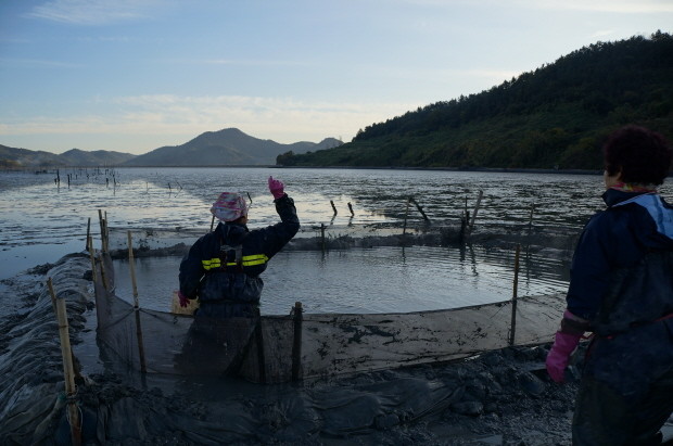 '맛의 황제', '타우린의 보고'를 불리는 가리맛 어린조개를 인공생산할 수 있는 길이 열린 가운데 13일 전남해양수산과학원 연구진들이 2년간의 연구 끝에 생산해낸 가리맛 어린 조개를 강진 앞바다에 살포하고 있다.