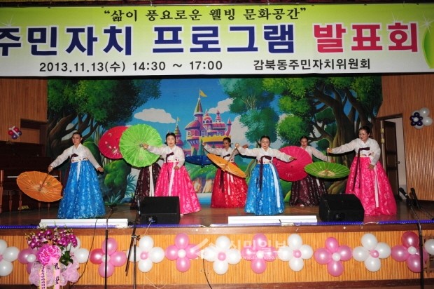 경기 하남시 감북동 주민자치위원회는 지난 13일 서부초등학교 실내체육관에서 '주민자치센터 발표회'를 열었다. 이번 공연에서는 난타, 스포츠댄스, 노래교실, 살풀이, 일산무 등 다양한 프로그램을 선보였다. 사진은 참가자들이 일산무를 추는 모습.